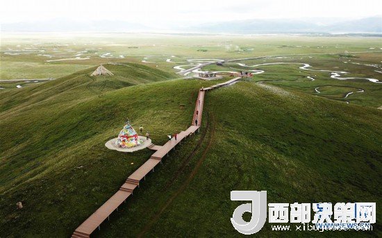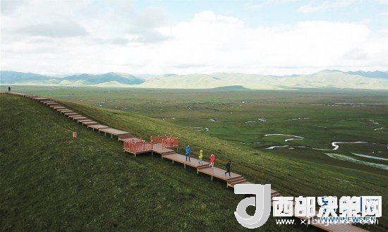 游客在瑪曲縣阿萬倉(cāng)濕地的觀景步道上游覽(7月31日無人機(jī)拍攝)。新華社記者 陳斌 攝