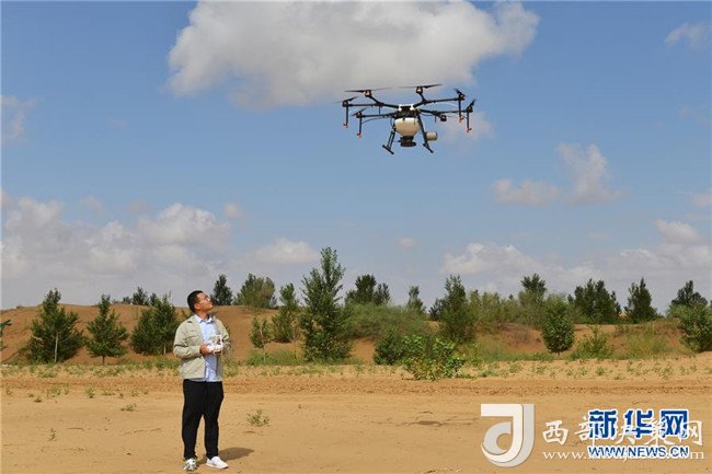 技術人員在內(nèi)蒙古鄂爾多斯市杭錦旗的庫布其沙漠里操控無人機飛播造林(7月11日攝)。 新華社記者 彭源 攝