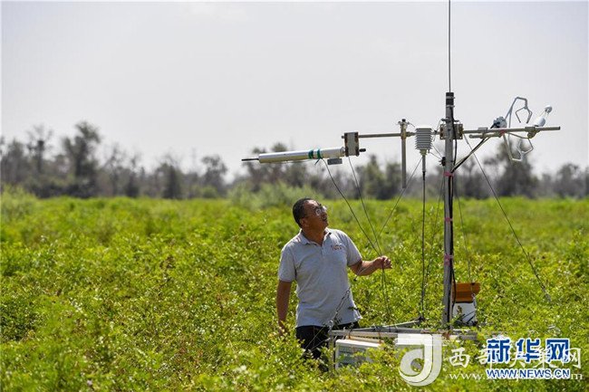 在內(nèi)蒙古鄂爾多斯市的庫布其沙漠中的億利集團阿木古龍甘草健康產(chǎn)業(yè)園,工作人員在儀器前觀測氣候土壤條件(7月11日攝)。 新華社記者 彭源 攝