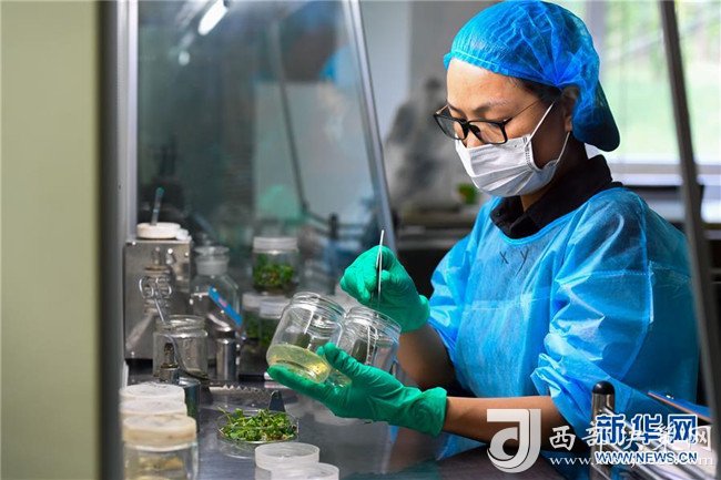在億利集團庫布其生態(tài)科技中心的沙生植物育苗實驗室內(nèi),科研人員進行組培試驗(7月11日攝)。 新華社記者 彭源 攝