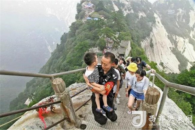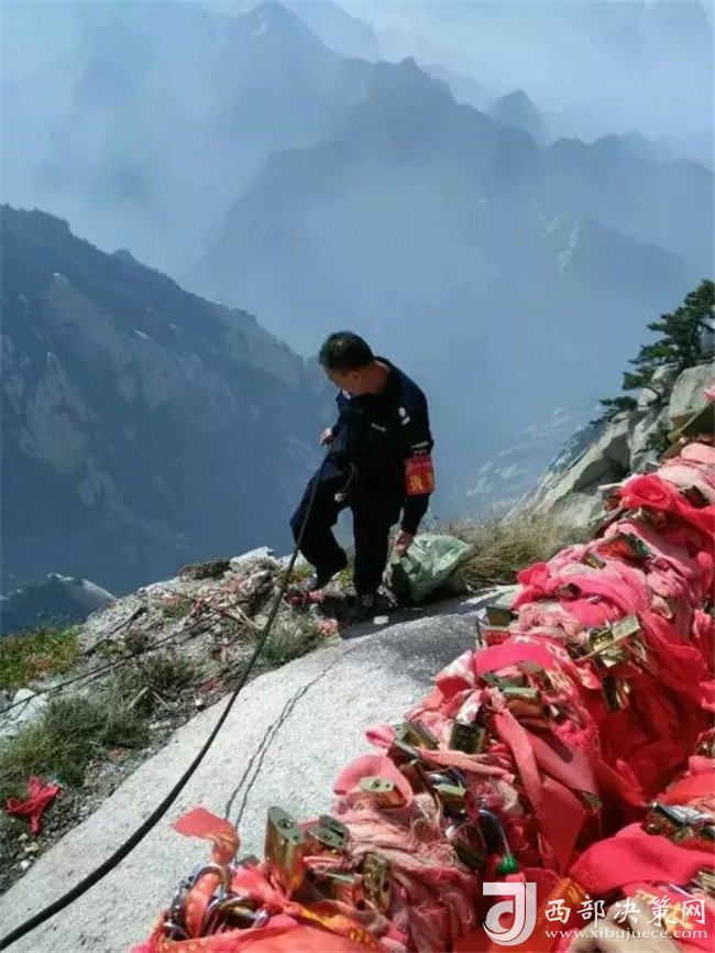 1979年出生的馮凱是華山景區(qū)負(fù)責(zé)蒼龍嶺段的一名安保員。這條長300米的責(zé)任路段,是華山最為險峻的地勢之一。單行,游客只能朝上攀爬;狹窄,臺階不足一米寬;陡峭,需要手腳并用,極為消耗體力。年紀(jì)稍大的游客腿腳不靈活,馮凱迅速上前攙扶;年幼的孩子走不動了,哭鬧不止,馮凱幫助孩子家長,帶著一家人順利通過;小姑娘爬山爬累了,坐在臺階上休息,馮凱要第一時間勸導(dǎo)她到云海平臺安全處再休息;有些游客喜歡在奇險處擺各種姿勢拍照,馮凱也要耐心細(xì)致地保護(hù)周全,以防意外,同時疏導(dǎo)人群,防止踩踏。遇到游客吸煙,馮凱要及時制止,耐心解釋。不間斷地巡查,馮凱是為了檢查鐵欄桿是否松動,臺階是否有破損,安全標(biāo)識是否完整。為了能第一時間出現(xiàn)在游客的身邊,300米的距離,馮凱得上上下下,走來走去幾十遍。這些都是馮凱的工作,而馮凱的工作內(nèi)容卻不僅僅是這些。