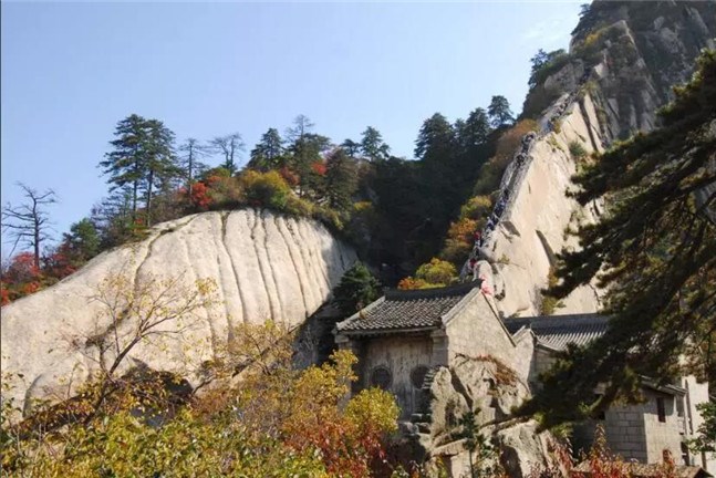 魏晉南北朝時,還沒有通向華山峰頂?shù)牡缆贰V钡教瞥?,隨著道教興盛,道徒開始居山建觀逐漸在北坡沿溪谷而上開鑿了一條險道,形成了"自古華山一條路"。