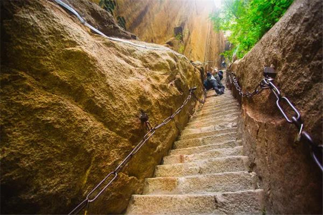 百尺峽位于千尺幢北,是登華山的第二個險境。“百尺峽”也叫“百丈崖”,兩壁欲合,卻被飛來的兩顆石塊從中撐開,人從石頭下鉆過,膽戰(zhàn)心驚,生怕石塊從兩壁間掉下來,這就是“驚心石”。通過此石懸著的心才放下來,再回頭看原來此處卡著的兩塊石頭,是上大下小故能安然無恙,所以這顆石頭也被稱之為“平心石”。韓愈詩中有“俄然神功就,殺氣見棱角”的描寫。
