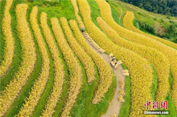 9月11日,航拍貴州省榕江縣陽開梯田秋色,農(nóng)民在田間勞作。中新社記者 賀俊怡 攝