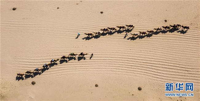 游客騎著駱駝在寧夏石嘴山市平羅縣沙湖景區(qū)觀光旅游(9月12日無人機(jī)拍攝)。 寧夏,地處中國西北腹地。這里的大山、大河、草原、沙漠、湖泊,猶如一幅幅美妙畫卷,讓人流連忘返。 新華社記者 王建華 攝
