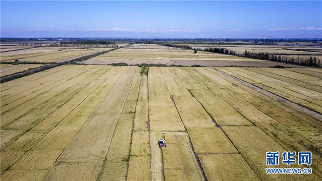 收割機在地處新疆察布查爾錫伯自治縣種羊場的“萬畝水稻優(yōu)質高產高效示范區(qū)”收割水稻(9月26日無人機拍攝)。眼下,地處新疆伊犁河谷的察布查爾錫伯自治縣約20萬畝水稻迎來收割季。當?shù)剞r民搶抓農時,忙碌在金色田園中。記者 胡虎虎 攝