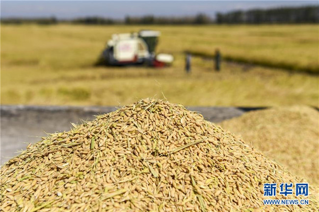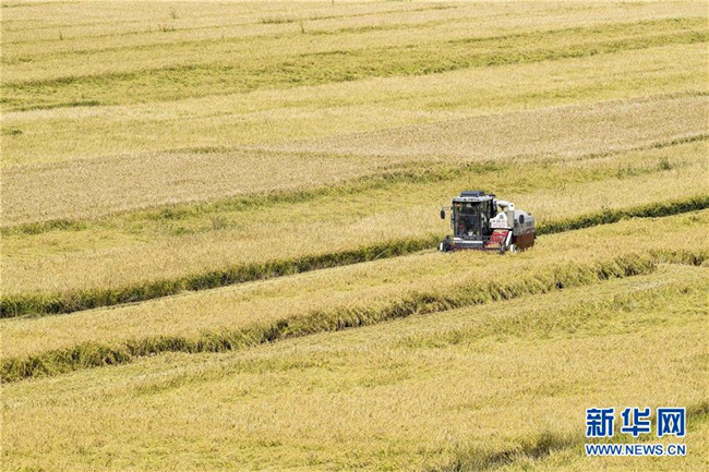 9月26日,收割機在新疆察布查爾錫伯自治縣納達齊牛錄鄉(xiāng)的一處稻田收割水稻。眼下,地處新疆伊犁河谷的察布查爾錫伯自治縣約20萬畝水稻迎來收割季。當?shù)剞r民搶抓農時,忙碌在金色田園中。記者 胡虎虎 攝