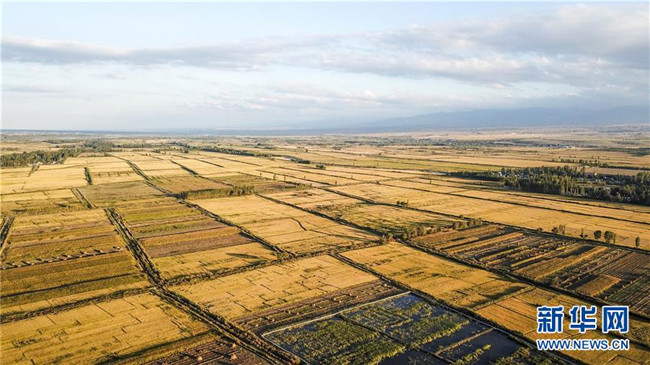 新疆察布查爾錫伯自治縣坎鄉(xiāng)待收割的水稻(9月25日無人機拍攝)。眼下,地處新疆伊犁河谷的察布查爾錫伯自治縣約20萬畝水稻迎來收割季。當?shù)剞r民搶抓農時,忙碌在金色田園中。記者 胡虎虎 攝