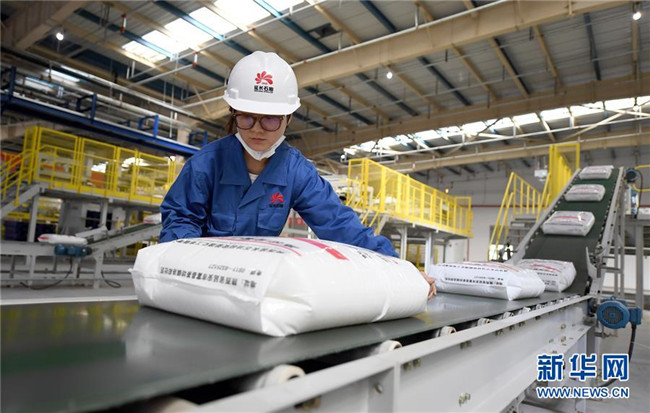 延安煤油氣資源綜合利用項(xiàng)目包裝車間的工作人員進(jìn)行產(chǎn)品包裝檢查(9月28日攝)。新華社記者 劉瀟 攝