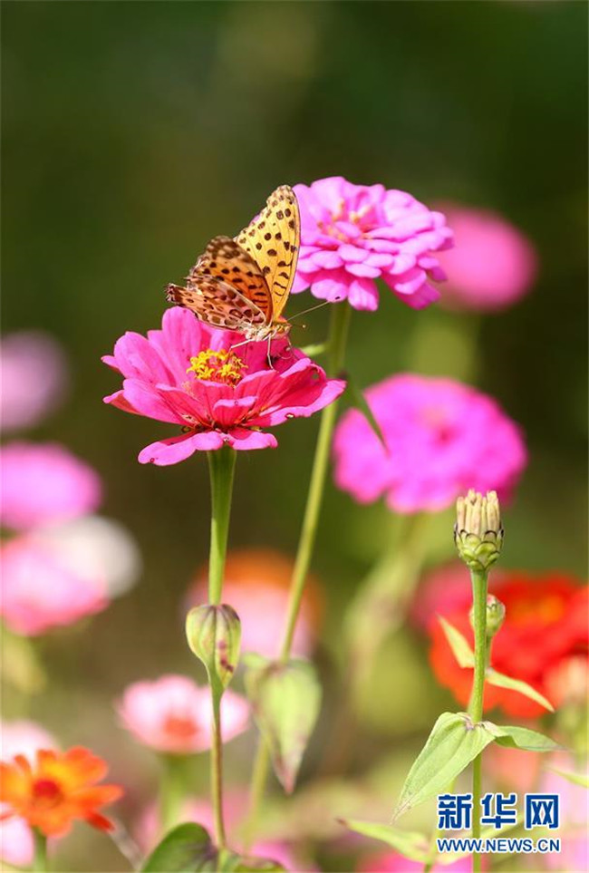 10月9日,在福建省泉州市德化縣桂陽鄉(xiāng)一家生態(tài)園,百日菊競相開放,引得蝴蝶蹁躚而至。  新華社發(fā)(張九強(qiáng) 攝)