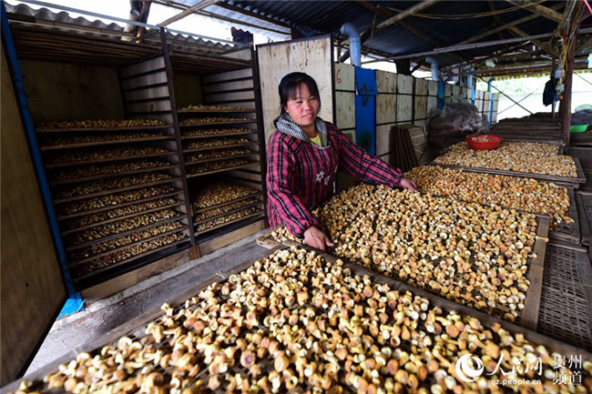 10月10日,村民在貴州省黔東南苗族侗族自治州丹寨縣排調(diào)鎮(zhèn)也改村姬松茸種植基地烘烤房篩選烘干的姬松茸。楊武魁 攝