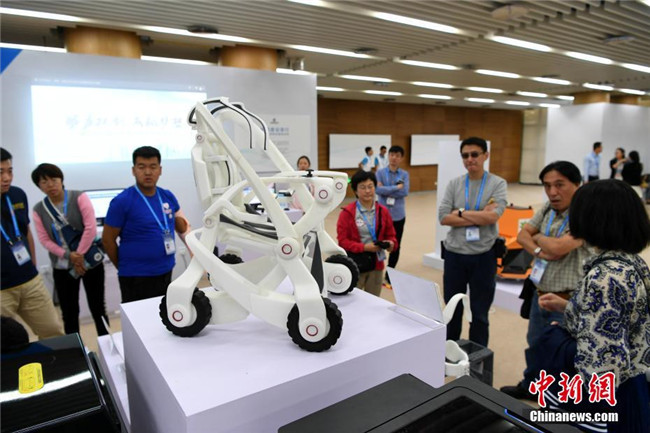 10月13日,第四屆中國(guó)“互聯(lián)網(wǎng)+”大學(xué)生創(chuàng)新創(chuàng)業(yè)大賽總決賽在廈門(mén)大學(xué)舉行。無(wú)人機(jī)、自助售飯機(jī)、人偶互動(dòng)、全息3D智能視頻、機(jī)器人輪椅、3D打印假肢手臂等大學(xué)生研發(fā)設(shè)計(jì)的產(chǎn)品亮相會(huì)場(chǎng),以“90后”為主的創(chuàng)新創(chuàng)業(yè)生力軍已全面發(fā)力,釋放出“青年+創(chuàng)新創(chuàng)業(yè)”的無(wú)窮力量。圖為3D打印個(gè)性化定制機(jī)器人輪椅展示。中新社記者 王東明 攝