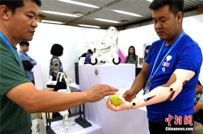 10月13日,第四屆中國(guó)“互聯(lián)網(wǎng)+”大學(xué)生創(chuàng)新創(chuàng)業(yè)大賽總決賽在廈門(mén)大學(xué)舉行。無(wú)人機(jī)、自助售飯機(jī)、人偶互動(dòng)、全息3D智能視頻、機(jī)器人輪椅、3D打印假肢手臂等大學(xué)生研發(fā)設(shè)計(jì)的產(chǎn)品亮相會(huì)場(chǎng),以“90后”為主的創(chuàng)新創(chuàng)業(yè)生力軍已全面發(fā)力,釋放出“青年+創(chuàng)新創(chuàng)業(yè)”的無(wú)窮力量。圖為3D打印假肢手臂展示。中新社記者 王東明 攝