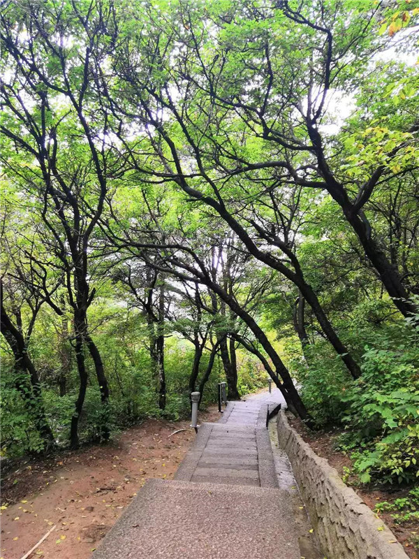 清晨,陽光穿過樹林灑在石階上,斑駁的光影隨風(fēng)自在地搖晃。茂密的樹林蒸騰起無數(shù)看不見的水汽,溫潤的撲在臉上,令人心曠神怡。
