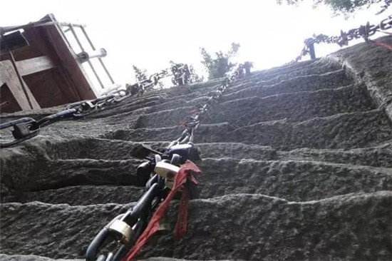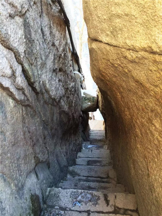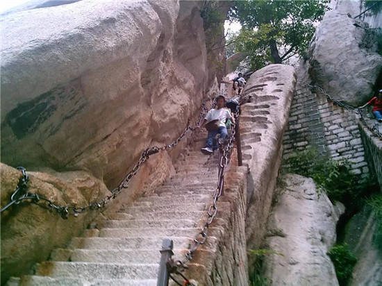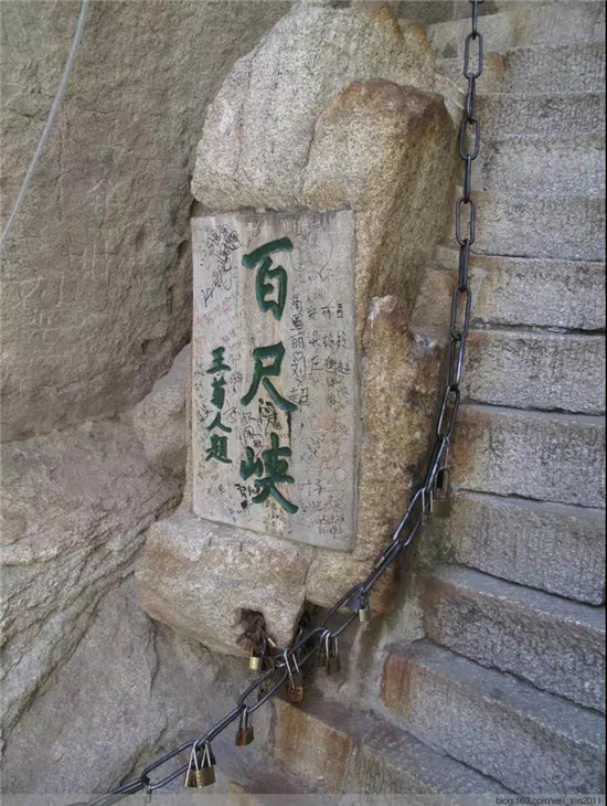 “千尺幢”在華山峪古道“回心石”上,是經(jīng)華山峪登主峰的必經(jīng)之道。這里原為一崖間裂隙,直立70度,后來(lái)人們沿隙鑿?fù)爻陕罚惺A370級(jí),階寬僅容半足,游人登臨時(shí),仰視一線天,俯視若臨深井。