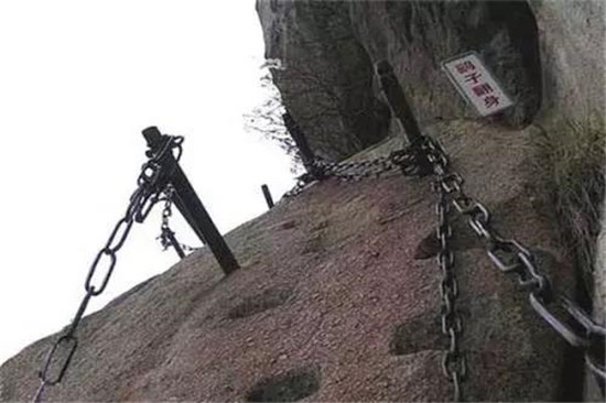 在南天門(mén)外,是華山著名險(xiǎn)道之首“長(zhǎng)空棧道”。棧道路分三段,出南天門(mén)石坊至朝元洞西,路依崖鑿出,長(zhǎng)20米,寬二尺許,是上段;折向下行,在崖隙間橫貫有鐵棍,形如凌空懸梯,游人須挽索逐級(jí)而下,稱(chēng)之“雞下架”,是中段;西折為下段,筑路者在峭壁上鑿出石孔,楔進(jìn)石樁,石樁之間架木椽三根,游人至此,面壁貼腹,腳踏木椽橫向移動(dòng)前行。這里只是探險(xiǎn)之道,并非登山必由之路,膽小的游客觀望一下即可,體力和膽量沒(méi)有把握則不要輕易冒險(xiǎn)。所以石刻上不少警告之語(yǔ),如“懸崖勒馬”等。