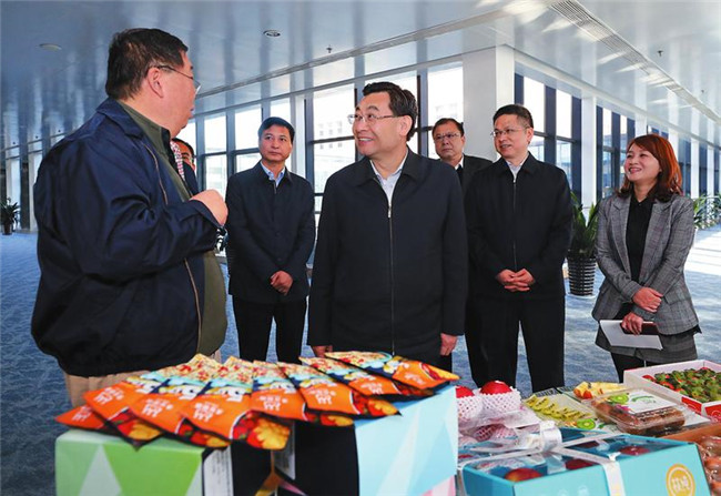 10月31日,省委書記胡和平深入西安市部分民營企業(yè)調(diào)研。圖為他在海升集團(tuán)果業(yè)總部聽取產(chǎn)品種類、產(chǎn)業(yè)扶貧等情況介紹。 記者 宋紅梅攝