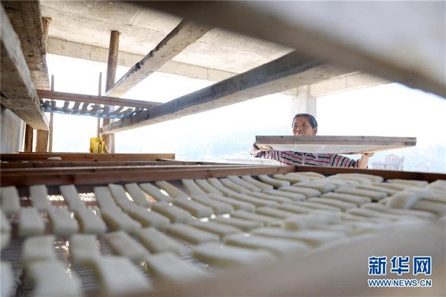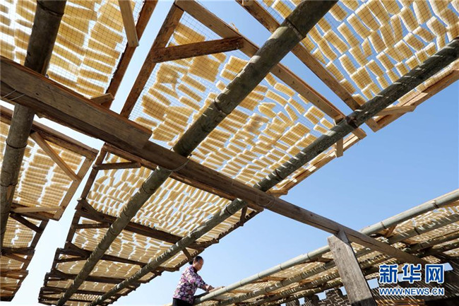 11月4日,在貴州省黎平縣中潮鎮(zhèn)佳所侗寨,村民在晾曬“侗果”粑塊。 近日,貴州省黔東南苗族侗族自治州黎平縣中潮鎮(zhèn)佳所侗寨的村民們搶抓晴好天氣,忙著制作、晾曬“侗果”,侗寨里一派忙碌。“侗果”是當(dāng)?shù)囟弊逋捅貍涞奶厣朗常菍⒄羰斓呐疵浊谐尚◆螇K后,再經(jīng)曬干、油炸、澆紅糖和上芝麻等工序制作而成。 新華社發(fā)(楊代富 攝)
