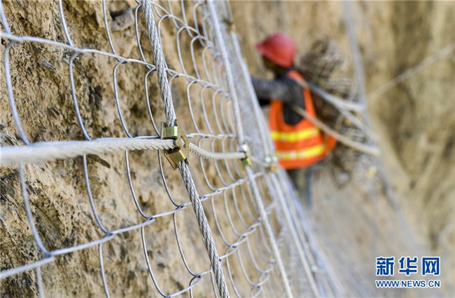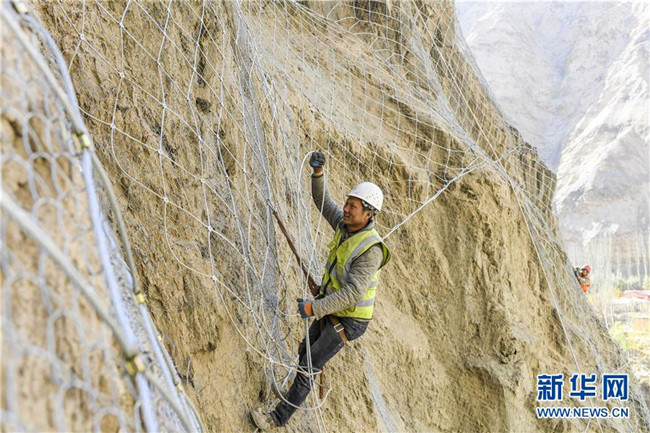 11月12日,在新疆塔什庫(kù)爾干塔吉克自治縣大同鄉(xiāng)阿依克日克村的一處路段,工人在峭壁上安裝防護(hù)網(wǎng)。 近日,一支由四川、云南等地工人組成的施工隊(duì)忙碌在帕米爾高原深處的大山中,為塔什庫(kù)爾干塔吉克自治縣縣城至大同鄉(xiāng)道路的易落石路段安裝防護(hù)網(wǎng)。崇山峻嶺間,工人要攀爬至峭壁上施工作業(yè),如躍動(dòng)在大山間的“舞者”。據(jù)介紹,這支施工隊(duì)常年活躍在新疆山區(qū)道路的施工現(xiàn)場(chǎng),為風(fēng)險(xiǎn)路段加裝安全防護(hù)裝置,保障過(guò)往車輛和沿途村民出行安全。 新華社記者 胡虎虎 攝