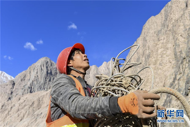 11月12日,在新疆塔什庫(kù)爾干塔吉克自治縣大同鄉(xiāng)鄉(xiāng)政府附近的一處路段,來(lái)自云南的王華國(guó)在運(yùn)送防護(hù)網(wǎng)。 近日,一支由四川、云南等地工人組成的施工隊(duì)忙碌在帕米爾高原深處的大山中,為塔什庫(kù)爾干塔吉克自治縣縣城至大同鄉(xiāng)道路的易落石路段安裝防護(hù)網(wǎng)。崇山峻嶺間,工人要攀爬至峭壁上施工作業(yè),如躍動(dòng)在大山間的“舞者”。據(jù)介紹,這支施工隊(duì)常年活躍在新疆山區(qū)道路的施工現(xiàn)場(chǎng),為風(fēng)險(xiǎn)路段加裝安全防護(hù)裝置,保障過(guò)往車輛和沿途村民出行安全。 新華社記者 胡虎虎 攝