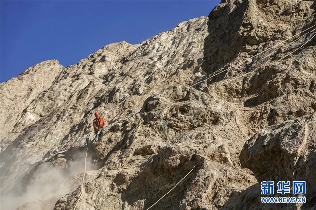 11月12日,在新疆塔什庫(kù)爾干塔吉克自治縣大同鄉(xiāng)鄉(xiāng)政府附近的一處路段,工人背著施工設(shè)備在峭壁上攀爬。 近日,一支由四川、云南等地工人組成的施工隊(duì)忙碌在帕米爾高原深處的大山中,為塔什庫(kù)爾干塔吉克自治縣縣城至大同鄉(xiāng)道路的易落石路段安裝防護(hù)網(wǎng)。崇山峻嶺間,工人要攀爬至峭壁上施工作業(yè),如躍動(dòng)在大山間的“舞者”。據(jù)介紹,這支施工隊(duì)常年活躍在新疆山區(qū)道路的施工現(xiàn)場(chǎng),為風(fēng)險(xiǎn)路段加裝安全防護(hù)裝置,保障過(guò)往車輛和沿途村民出行安全。 新華社記者 胡虎虎 攝