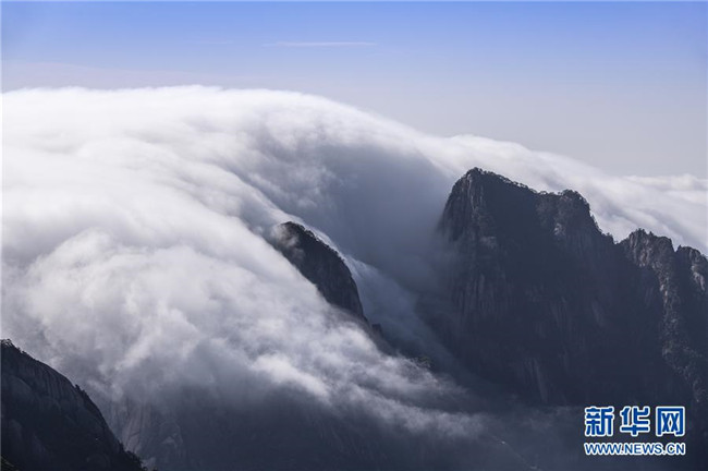 11月20日,安徽黃山風景區(qū)雨后放晴,流云在氣流的作用下從山峰之間傾瀉而下,形成壯美的“瀑布流云”景觀。 新華社發(fā)(水從澤 攝)
