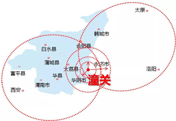潼關(guān)地理位置優(yōu)越、歷史文化厚重,且居西安、太原、洛陽三大城市經(jīng)濟(jì)輻射圈的中心。距華山約20公里。