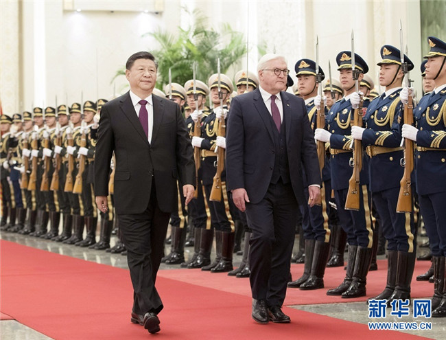 會談前,習(xí)近平在人民大會堂北大廳為施泰因邁爾舉行歡迎儀式。楊潔篪、丁仲禮、王毅、夏寶龍、何立峰等參加。(記者白潔)