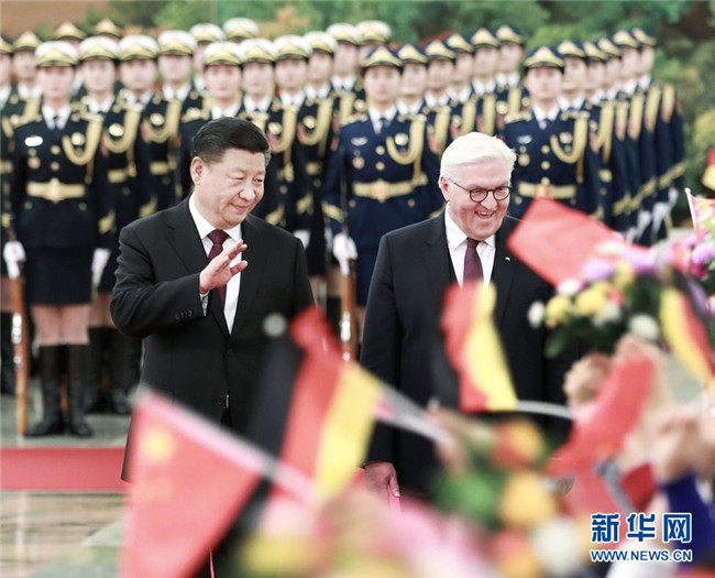 國家主席習(xí)近平10日在人民大會堂同德國總統(tǒng)施泰因邁爾舉行會談。兩國元首一致同意,加深互信,合作共贏,推動中德全方位戰(zhàn)略伙伴關(guān)系繼續(xù)深入發(fā)展,讓中德合作取得更多有利于兩國和兩國人民、有利于世界和平與繁榮的成果。