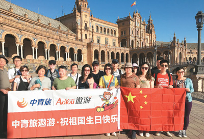 今年國(guó)慶黃金周,中國(guó)游客在西班牙祝福祖國(guó)。中青旅供圖 |