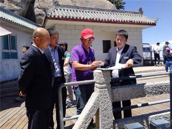 其實(shí),雷科峰平時對大家要求挺嚴(yán)的,職工背后議論說雷科峰有一種軍人作風(fēng),凌厲、硬氣,大家跟上他干事活多還辛苦。印象最深的是那一次美化南天門“三間房一頁瓦”附近的臺地。坑洼不平的臺地上原來蒙著一堆土,晴天一層灰,雨天滿地泥,冬天雪泥一凍一消,平臺就成了沼澤,不說過來過去行走不便,看起來也讓人不舒服,游客常常一不小心就濺得滿身的泥水,很掃興,雷科峰下決心美化平臺。美化平臺所用的沙子、石子、水泥要到二三里路遠(yuǎn)的溝底去背。從山頂?shù)綔系?,一路上全是立坡陡崖,雷科峰領(lǐng)著十幾名職工利用六天的工余時間,硬是把近二十噸的沙石背了上來。背料過程中,有的職工肩膀磨破了,有的雙腿像篩糠一樣抖個不停,許多職工中途不敢蹴下來休息,怕一蹴下就再也站不起來了,歇息時把沙袋子擱在路邊的石坎上,人站著緩口氣……一個個汗流浹背,氣喘吁吁。