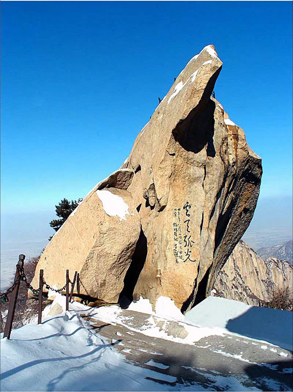 古人云:“山無石不奇,無純石不大奇”。華山之所以雄奇瑰偉,風(fēng)姿獨(dú)具,首先就在于它的主體由一塊純粹完整的巨型花崗巖構(gòu)成。遠(yuǎn)古時(shí)代的地質(zhì)造山運(yùn)動(dòng),由巖漿冷凝形成的垂直節(jié)理的花崗巖體構(gòu)成了華山奇險(xiǎn)俊秀的自然景觀。作為一塊“天然巨石”,萬千年來,華山緊緊依偎著秦嶺,成為秦嶺主脈一座特立獨(dú)行的花崗巖山。憑借大自然風(fēng)云變幻的裝扮,華山的千姿萬態(tài)被有聲有色地勾畫出來。
