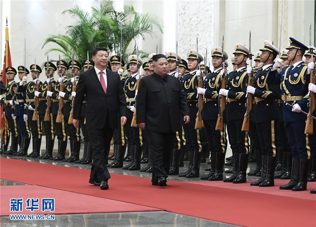 會(huì)談前,習(xí)近平在人民大會(huì)堂北大廳為金正恩舉行歡迎儀式。