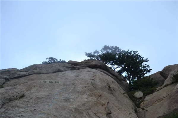 我和孩子抓緊時間往東峰趕,經(jīng)紫氣臺、二仙坎,攀爬一道石梁前往東峰山門。此時飄來小雨點,我們顧不得腳下濕滑加快了腳步。經(jīng)鷂子翻身,孩子想要征服天險的念頭依然強(qiáng)烈,一心想翻鷂子翻身,后因人多需排隊等候而暫時放棄。東峰又叫朝陽峰,朝陽臺是觀日出的勝地。我倆左轉(zhuǎn)攀爬朝陽臺,雨漸漸大起來。至臺頂,方舉目四顧,黃豆大小的密集雨點劈頭蓋臉砸下。朝陽臺上沒有看到太陽,卻遭遇暴雨,我們狼狽撤離朝陽臺。