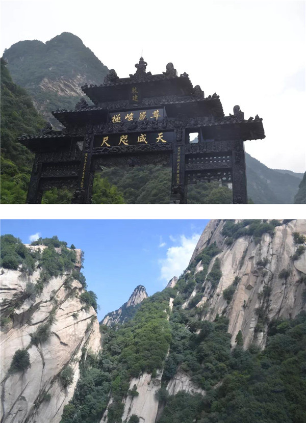 往西可去往中峰,往南可順原路返回,因暴雨如注,只得放棄攀爬中峰。順原路經(jīng)鷂子翻身,孩子仍念念不忘:“媽媽,這會兒大暴雨,肯定沒人排隊,咱們?nèi)シ_子翻身!”聽了孩子“初生牛犢不畏虎”的話,我不由哈哈大笑:“小傻瓜!這么大的暴雨,有誰去翻鷂子翻身呢?不要命啦?”在鷂子翻身入口處,孩子還是萬般眷戀地探身查看,當(dāng)看到還未來得及撤離的人員身系保險繩懸掛在峭壁上,就像風(fēng)雨中掉著蛛絲的蜘蛛,被風(fēng)雨襲擊的無處藏身、進(jìn)退兩難,方才知道了害怕。