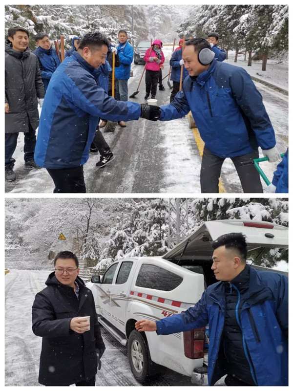 1月31日凌晨景區(qū)出現(xiàn)強(qiáng)降雪天氣,道路積雪嚴(yán)重影響行車安全。華旅集團(tuán)第一時(shí)間多渠道發(fā)布景區(qū)推遲運(yùn)營(yíng)時(shí)間的信息,并向游客做好解釋工作,同時(shí)號(hào)召集團(tuán)各部室、各單位迅速組織人員赴進(jìn)山公路進(jìn)行掃雪除冰,經(jīng)過(guò)三個(gè)小時(shí)的全力清掃,東線進(jìn)山公路積雪清理完畢,景區(qū)在短時(shí)間內(nèi)恢復(fù)運(yùn)營(yíng),西線索道進(jìn)山公路及華山峪區(qū)域不斷加大清掃力度,盡力實(shí)現(xiàn)景區(qū)全線貫通。