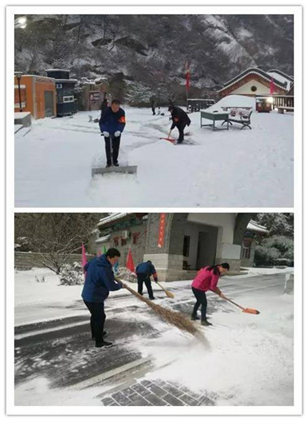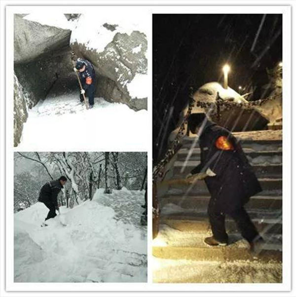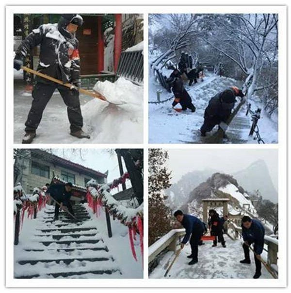 2月9日晚,一場大雪突降華山景區(qū),當工作人員與游客一起沉浸在新年的喜悅氛圍時,華山景區(qū)悄然鋪上了一層厚厚的積雪。2月10日早6時,華旅集團通過多渠道號召全體員工在各自崗位迅速開展掃雪除冰工作。雪情就是命令,來不及欣賞新年首場雪景,廣大員工扛起掃把鐵鍬等掃雪工具,第一時間奔赴“戰(zhàn)場”,全力確保景區(qū)恢復運營。