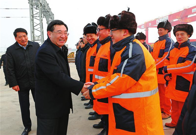 二月十一日,省委書記胡和平在西安市調(diào)研樞紐經(jīng)濟(jì)、門戶經(jīng)濟(jì)、流動(dòng)經(jīng)濟(jì)發(fā)展情況。圖為他在西安鐵路集裝箱中心站慰問(wèn)春節(jié)期間堅(jiān)守一線的中歐班列長(zhǎng)安號(hào)工作人員。本報(bào)記者宋紅梅攝