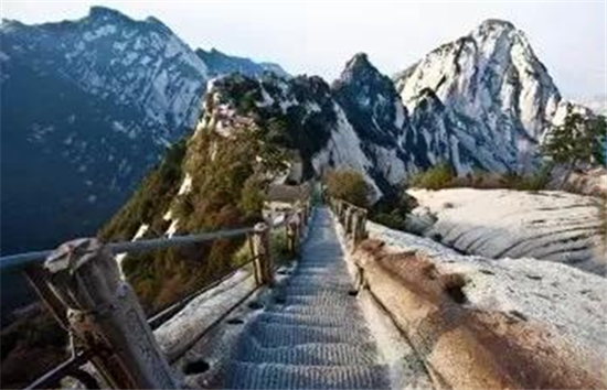 這是一個溫暖的美麗秋天,華山壯觀的峭壁在陽光下閃閃發(fā)亮,稀有樹木炫耀著多彩的秋葉,遠(yuǎn)方跳躍的瀑布吸引著游客的眼球,奇形怪狀的點(diǎn)點(diǎn)白云在腳下緩緩流動。我和我的朋友開始了一場艱苦的旅行,一起攀登6,600多級鑿在巖石上的臺階,目標(biāo)是海拔2154.9米南峰之巔祭祀華山神的道觀?! ?