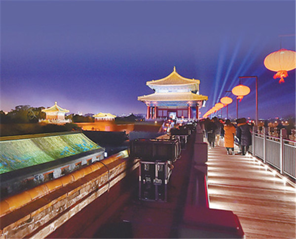 觀眾入場前,可觀賞午門城樓及東、西雁翅樓在燈光映照下的壯美雄姿。自午門入場后,首先觀賞點(diǎn)亮后的太和門廣場,隨后由午門西馬道登午門城樓,參觀“紫禁城里過大年”展覽,在東雁翅樓欣賞中央民族樂團(tuán)琵琶演奏家趙聰及其團(tuán)隊(duì)的演奏。結(jié)束午門展廳參觀后,觀眾沿著由紅燈籠點(diǎn)綴的城墻步行至東南角樓,觀看虛擬現(xiàn)實(shí)影片《角樓》,隨后來到東華門城樓,參觀“營造之道——紫禁城建筑藝術(shù)展”。當(dāng)走過近千米長的布滿紅燈籠的故宮東城墻時,可以看到臨近城墻西側(cè)的部分古建筑也被點(diǎn)亮,聆聽暢音閣戲樓傳來的戲曲聲。到達(dá)東北角樓后,觀眾步行至神武門,在這一區(qū)域可以觀賞到城墻南北兩側(cè)通過藝術(shù)燈光投影于建筑屋頂上的《千里江山圖》等作品,從而產(chǎn)生人在畫中游的感覺。離開神武門城樓后,神武門外東、西兩側(cè)的角樓餐廳和角樓咖啡靜候光臨,從而結(jié)束此次“上元之夜”文化活動。