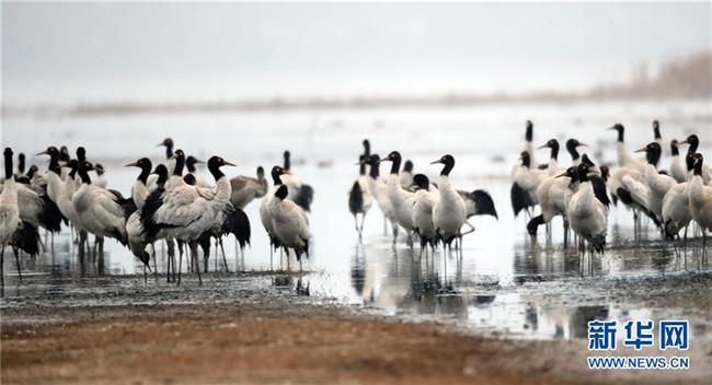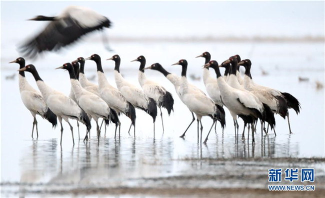 2月21日在草海國(guó)家級(jí)自然保護(hù)區(qū)內(nèi)拍攝的黑頸鶴。新華社發(fā)(韓賢普攝)