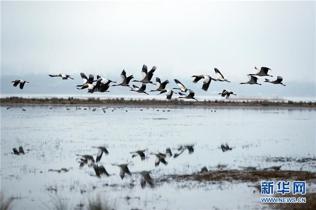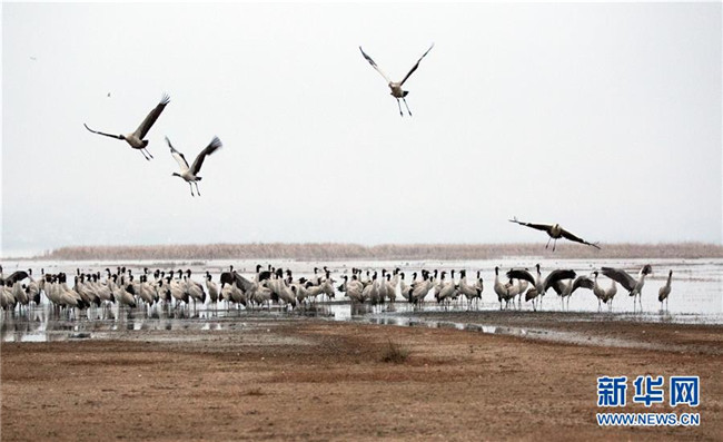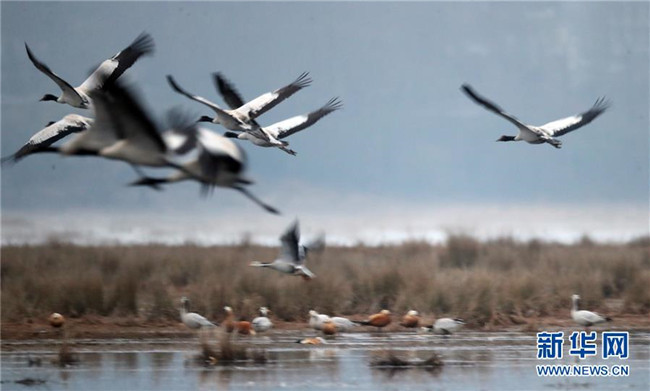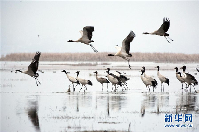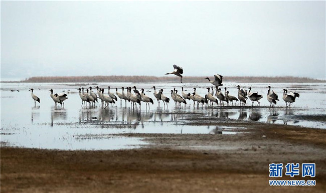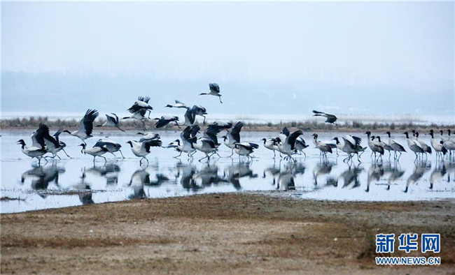 草海保護(hù)區(qū)是黑頸鶴越冬的主要棲息地之一,其在草海越冬期約為每年10月下旬到次年3月底。黑頸鶴是全球唯一在高原生長(zhǎng)、繁殖的鶴類(lèi)。新華社記者楊楹攝