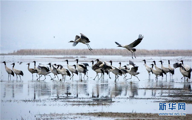 當(dāng)日,貴州省威寧彝族回族苗族自治縣草海國(guó)家級(jí)自然保護(hù)區(qū)內(nèi),黑頸鶴翩躚起舞、姿態(tài)萬(wàn)千。
