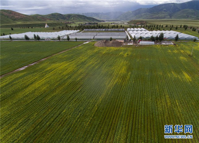 這是理塘縣濯桑鄉(xiāng)濯?,F代農業(yè)雙創(chuàng)中心(2018年8月11日無人機拍攝)。理塘縣甲洼鎮(zhèn)、濯桑鄉(xiāng)等鄉(xiāng)鎮(zhèn)集中使用產業(yè)扶持資金,跨村集中抱團發(fā)展設施蔬菜大棚,讓貧困人口在園區(qū)獲得穩(wěn)定收益。新華社記者 江宏景 攝