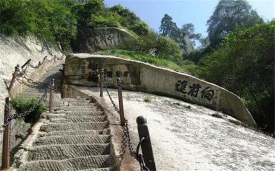 因嶺脊青黑,蜿蜓盤旋,就像蒼龍騰空,因而得名。嶺脊上、下高差約500米。在唐代以前,此路初通,僅鑿石窩,兩邊并未加欄,登嶺多是爬行,如騎龍背。到了明代,這里雖比唐代好些,但仍然很危險(xiǎn)。解放后,1964年,將原嶺魚脊形鑿平加欄,1985年,又繼續(xù)下鑿,才將嶺道拓寬。現(xiàn)在游人至此便不覺有多危險(xiǎn)了。