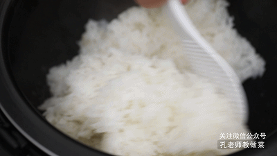 2.電飯鍋選“精煮檔”煮米,待功能結(jié)束后揭開(kāi)蓋子,聞到米飯香氣撲鼻,用飯勺將米飯打散,再燜5分鐘。