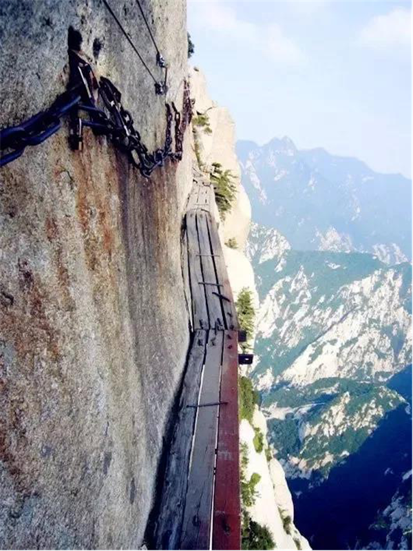 我站在華山兩塊窄窄的木板上,依靠鐵釘楔入巖石作為支撐,我的腳下,是1000米的深谷,冰雪的路面很滑。我來(lái)華山旅游純粹是因?yàn)樵诨ヂ?lián)網(wǎng)上瘋傳的一張圖片,也就是指“世界上最危險(xiǎn)的登山路”那張。現(xiàn)在有了安全保護(hù)措施,實(shí)際上用不著擔(dān)心危險(xiǎn)了??謶致可闲念^,頭腦變得有些麻木。西安是中國(guó)的古城,在強(qiáng)盛朝代時(shí)期占有重要的歷史地位。