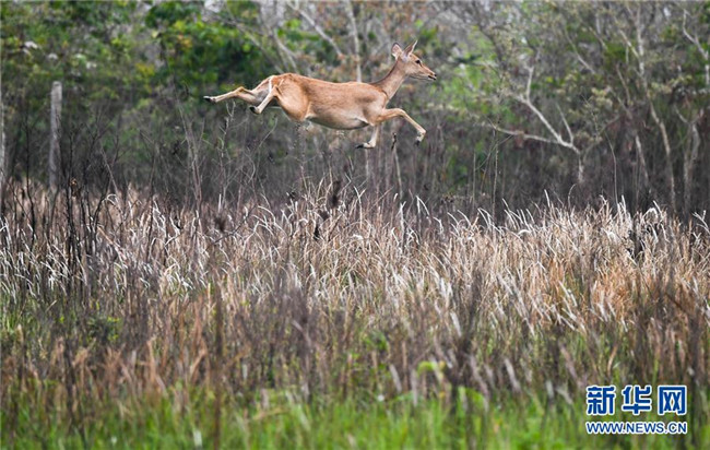 在海南大田坡鹿自然保護(hù)區(qū)內(nèi),一只坡鹿飛躍草叢(2018年4月3日攝)。國(guó)家一級(jí)保護(hù)動(dòng)物海南坡鹿是特產(chǎn)于海南島的熱帶珍稀鹿種,20世紀(jì)曾瀕臨滅絕。近年來,當(dāng)?shù)赝ㄟ^多種方式開展保護(hù)?,F(xiàn)在,海南坡鹿數(shù)量逐漸增多、種群逐漸穩(wěn)定,成為海南綠色生態(tài)的一張名片。 新華社記者 楊冠宇 攝