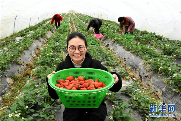 2018年2月27日,王萌萌展示剛采摘的草莓。全國人大代表王萌萌是安徽省定遠(yuǎn)縣西孔村一名大學(xué)生“村官”,她帶領(lǐng)村民建立起草莓園、蔬菜園、育秧工廠等特色項目,吸引游客前來采摘,村民的日子越過越紅火。 新華社發(fā)(馮再雷 攝)