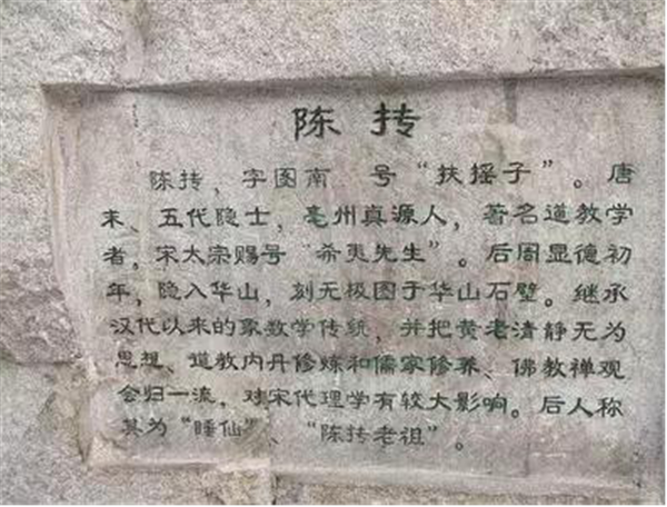 陳摶:陳摶(872年—989年),字“圖南”,號“扶搖子”、“希夷先生”(“希”指視而不見,“夷”指聽而不聞),常被視為神仙,尊稱為陳摶老祖、希夷祖師等。主張以睡眠,休養(yǎng)生息,時常一眠數日,人稱睡仙。相傳紫微斗數及無極圖說皆為陳摶之創(chuàng)作。五代末,宋朝初期亳州真源(今河南鹿邑)人,著名華山派道士。